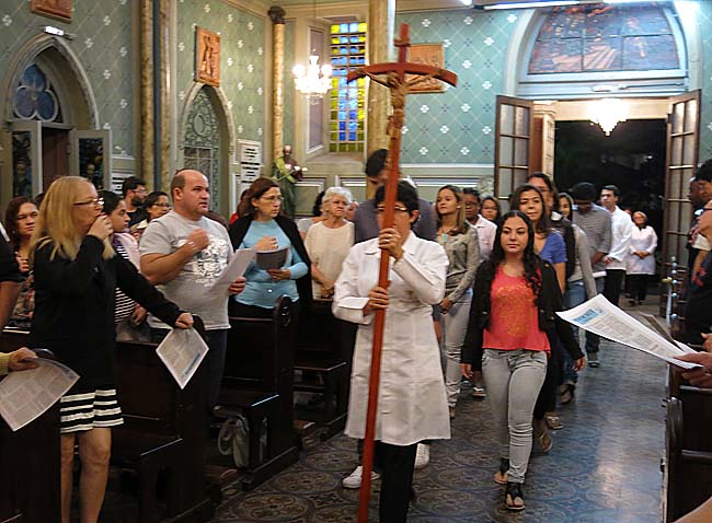 O início da missa com a Procissão da Cruz seguida por grupo de jovens da Paróquia do Divino Espírito Santo, que depois, participariam da cerimônia de Lava-Pés.