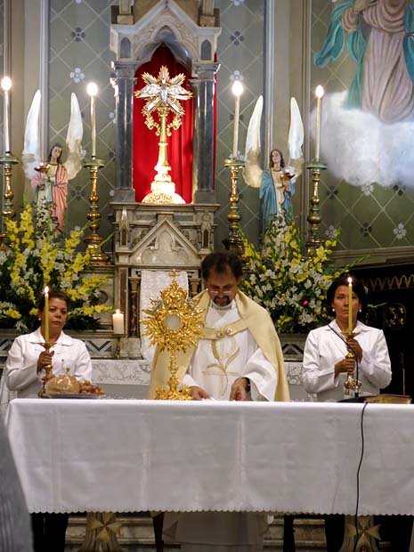 O Santíssimo Sacramento carregado pelo pároco retorna à Igreja encerrando a procissão e para ficar exposto aos fiéis para suas orações.