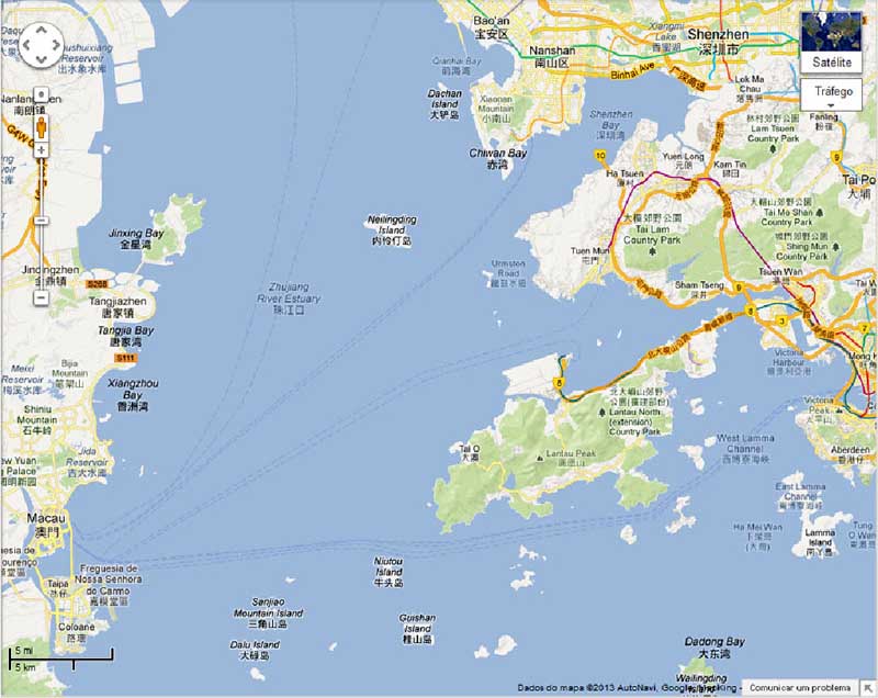 1- A rota dos «ferries» Macau-Hong Kong (a tracejado), passando pelo do Sul da Ilha de Lantau (clicar para aumentar)