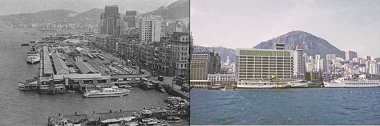 (foto da esquerda) 30- O terminal de Hong Kong, em 1966, vendo-se um «ferry» à esquerda e um «hydrofoil» em baixo. (da direita) 31- O mesmo terminal, nos anos 70s, vendo-se ao centro o «Tung Shan (ex-Tak Shing)» atracado
