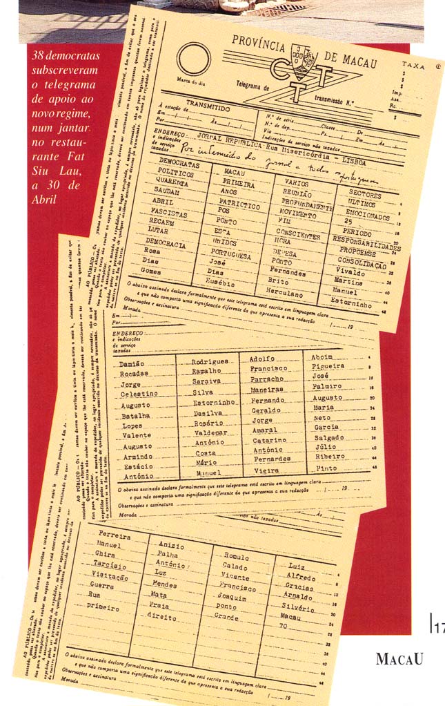 38 Democratas de Macau subscreveram o telegrama abaixo de apoio ao novo regime, num jantar no restaurante Fat Siu Lau (foto acima) a 30 de Abril