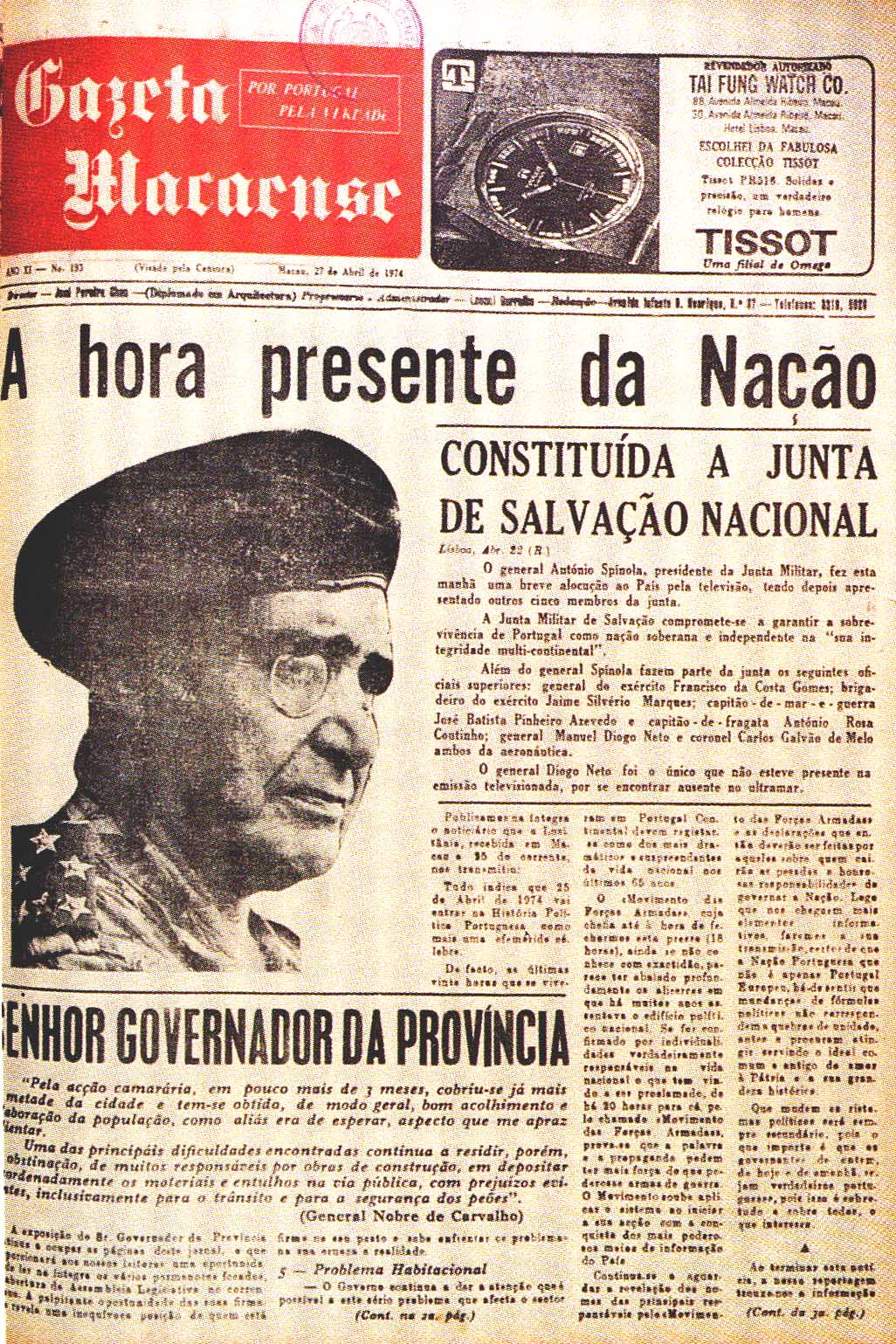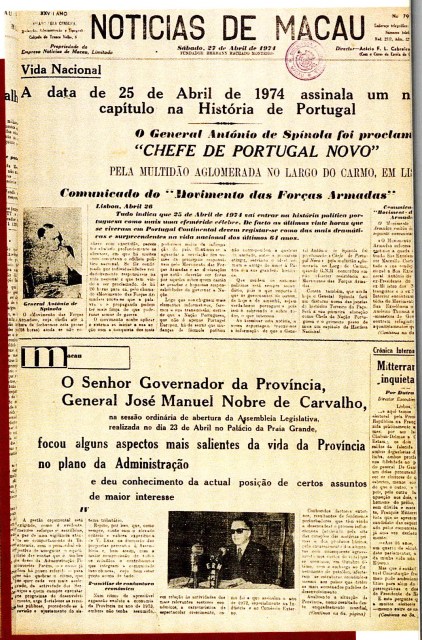 “25 de Abril” ou a Revolução dos Cravos, significou o fim do regime ditatorial do Estado Novo vigente desde 1933 em Portugal. Foi um golpe de Estado militar que ocorreu em 1974. Os jornais da distante Macau somente noticiaram o golpe dois dias depois, no dia 27.