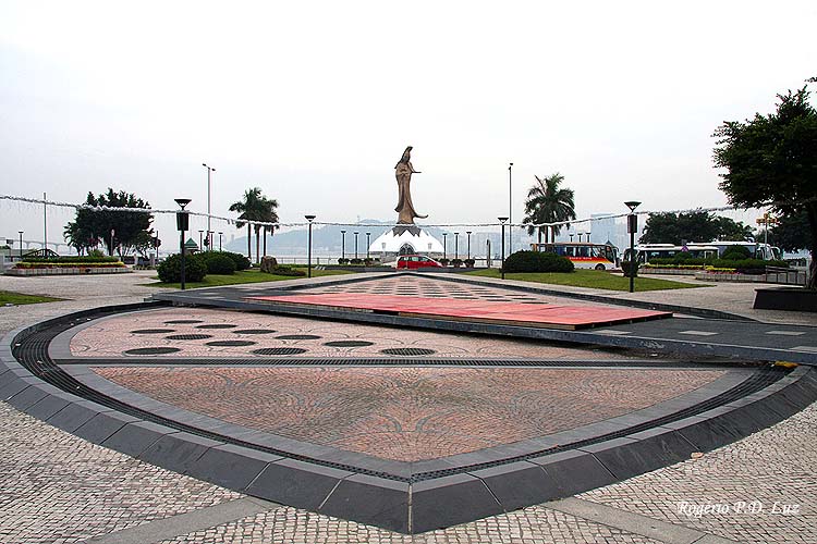 O impacto da escultura da Deusa, com 20 metros de altura, fundida em 50 toneladas de bronze, erigida sobre uma cúpula de betão simbolizando a Flor de Lótus, o Centro Ecuménico, pode ver-se a vários quilómetros de distância da terra e do mar. Para a sua edificação foi necessário um trabalho de assoreamento, em frente aos novos aterros do Porto Exterior de Macau, em plena Foz do Rio das Pérolas, na construção de uma ilha artificial ligada a terra por um istmo com 65 metros.