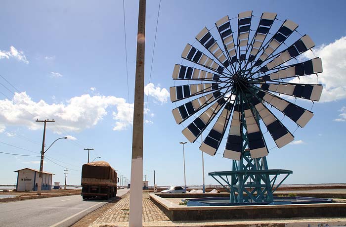1 – No acesso à cidade, que antigamente era uma ilha e depois ligada por um istmo ou um aterro que virou estrada (foto abaixo), está o símbolo da Macau-RN: um antigo moinho utilizado para movimentar as águas nos cristalizadores para fabricação do sal. A estrada é cercada dos dois lados por grandes tanques ou lagos (da SALINOR) com água que meses depois, com a sua evaporação, o resíduo será o sal a ser recolhido para industrialização.
