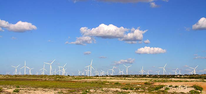 Parque de energia eólica da Petrobrás com novos aerogeradores, visto praticamente no fim da rua da via costeira de Diogo Lopes