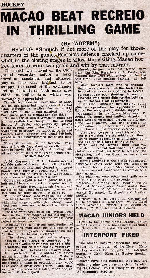 Esta postagem traz a entrevista que o “Adé” – José dos Santos Ferreira concedeu ao “Zéca” da Gazeta Macaense, em 02/03/1983 a respeito do hockey de Macau dos tempos antigos, especialmente dos anos 30 e 40. E, para complementar, as fotos da época publicadas em jornais de Hong Kong, bem como, dois artigos em inglês de jogos disputados entre os macaenses e ingleses.