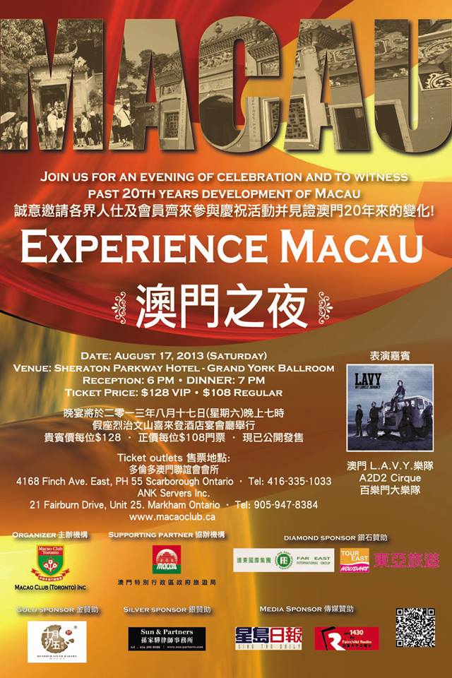 No passado dia 17 de Agosto de 2013, o Macao Club sediado em Toronto, Canadá, comemorou 20 anos de sua fundação em 1993 com uma festa de gala realizada no Sheraton Parkway. Contou com uma expressiva participação da comunidade chinesa, bem como de personalidades canadenses/canadianas e membros da Casa de Macau de Toronto, sua vizinha, no mesmo endereço da sede social.