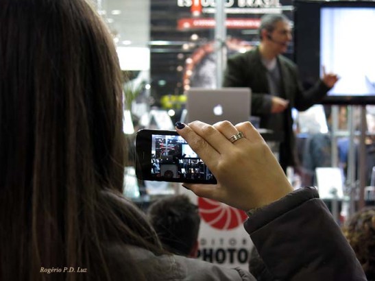Visitante filma a palestra sobre fotografia no stand da Editora Photos. Em horários contínuos e nos 3 dias da feira, você assiste gratuitamente a vários tipos de palestras em diversos stands que dão boas dicas de fotografia em geral