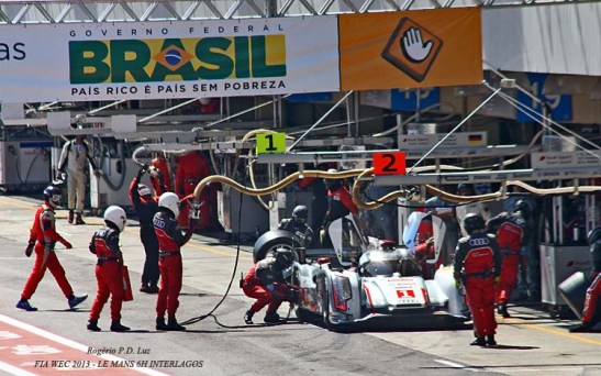 Trabalho nos boxes com reabastecimento, troca de pneus e de piloto