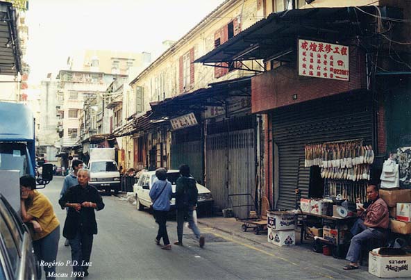 Avenida Almeda Ribeiro, em Macau. A denominação em chinês: San Má Lou. Foi em 1993, e a mercearia Soi Cheong ainda existia na esquina do lado direito (anúncio em verde)