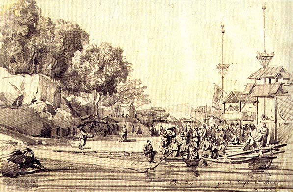 As obras dos primeiros pintores ocidentais que tiveram contacto com a China, vindos até aqui em navios comerciais estrangeiros, tinham como principais temas paisagens e habitantes nativos nas suas tradicionais ocupações e mesteres. Estas obras, construídas a partir de anotações ao vivo do meio ambiente e do povo, foram depois reproduzidas para serem vendidas aos cada vez mais freqüentes visitantes estrangeiros da China, que as levavam para os seus países onde eram objecto de grande curiosidade.