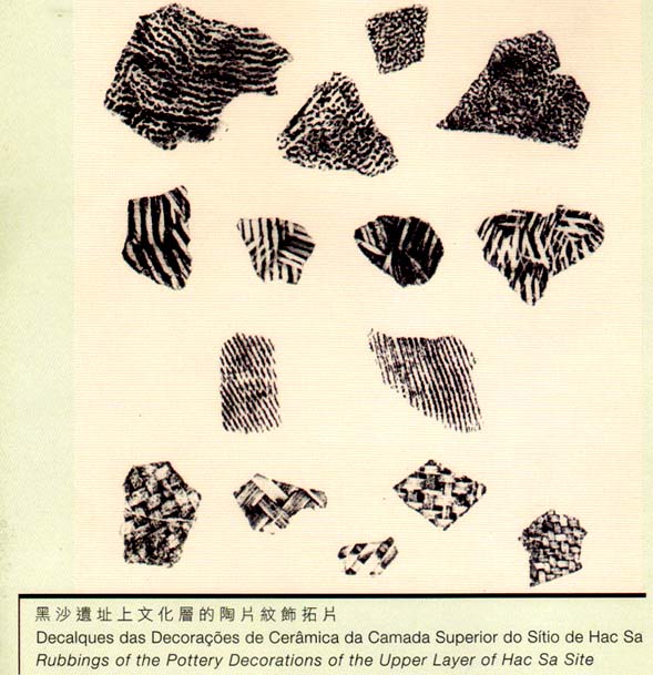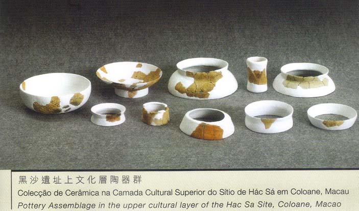A cerâmica descoberta na camada inferior do sítio de Hác Sá é praticamente constituída por peças pintadas. Algumas das peças identificáveis incluem pratos com pé, num total de mais de dez peças. Tais pratos pintados com pé foram extensamente encontrados em Macau, Zhuhai, Shenzen, Zhongshan, Dongguan, Zengcheng, Zhaoqing, Haifeng, e noutros locais. A distribuição das cerâmicas coincide exactamente com a rede de comunicação de água do estuário do Rio das Pérolas, o que significa que os residentes pré-históricos do Neolítico Médio dominavam técnicas de navegação comparativamente avançadas. (Museu de Arte de Macau)