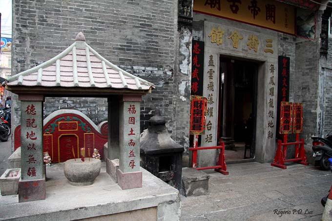 “A sua construção é contemporânea ao estabelecimento dos Portugueses nesta colónia e o seu nome derivado do facto dela ter sido fundada pelos moradores das três primeiras ruas de comércio que existiam em Macau, isto é, a dos Ervanários, a das Estalagens e a da Porta de Pedra.”