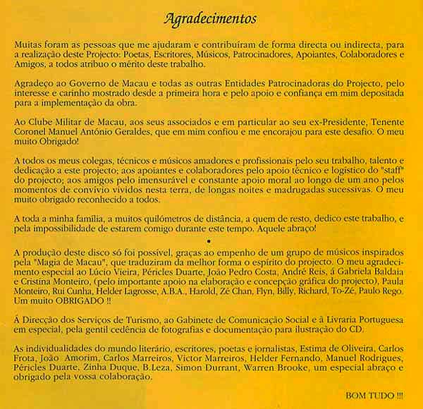 O título do cd é ‘Macau 99’, produzido antes da transição, numa época em que pudemos colecionar bons discos sobre Macau cantados em português e inglês, algo que faz falta nos dias de hoje. A música, que é também cultura, parece que foi esquecida! Uma pena.