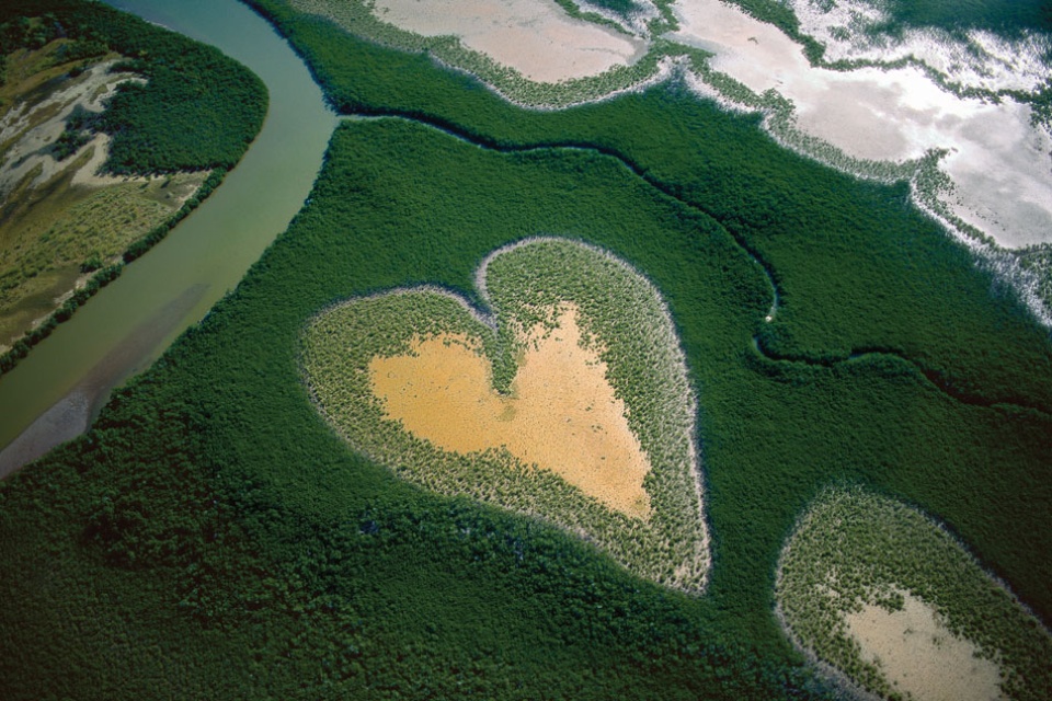 O manguezal, floresta semiterrestre e semiaquática, desenvolve-se nos solos lodosos tropicais expostos às alternâncias de marés. Constituído por diversas plantas halófitas (capazes de viver em solos salgados), com uma predominância de mangues, ele reveste quase 1/4 dos litorais tropicais e cobre cerca de 15 milhões de hectares no mundo. Esse meio frágil recua continuamente diante da excessiva exploração de recursos, da expansão agrícola e urbana, do desenvolvimento das criações de camarões e da poluição. Contudo, o manguezal ainda é indispensável à fauna marinha e ao equilíbrio do litoral, assim como à economia local. A Nova Caledônia, conjunto de ilhas do Pacífico que cobre 18.575km2, conta com 200km2 de um manguezal bastante baixo (8 a 10m de altura) mas muito denso, principalmente na costa oeste da Grande-Terre, ilha mais importante do arquipélago neocaledônio. No interior das terras, onde a água marinha só penetra no momento das grandes marés, a vegetação cede lugar a extensões nuas e extremamente salgadas chamadas tanne, como perto da localidade de Voh, onde a natureza desenhou essa clareira em forma de coração estilizado.