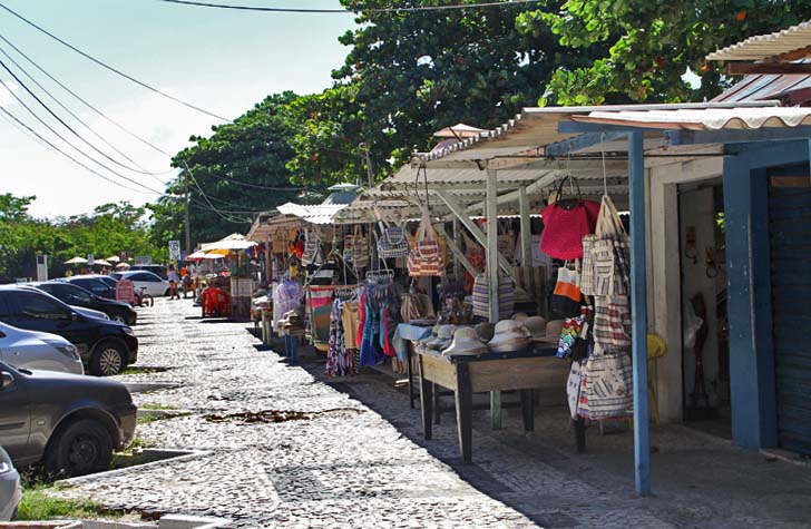 Barracas com artesanato, souvenirs, lanchonetes, e precário banheiro público
