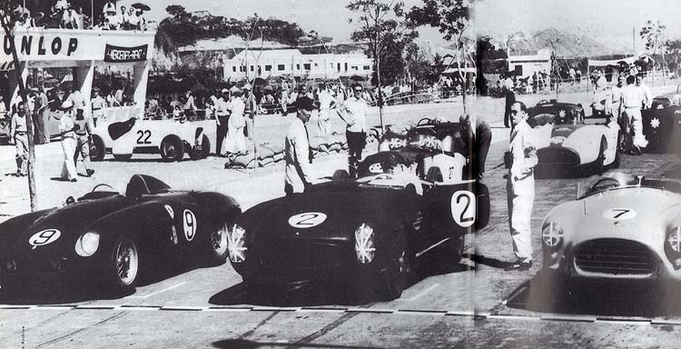 GP de 1957: da direita (pole-position) R.Hardwick (7) num AC Ace Bristol; George Pateman (2) com o seu Mercedes Benz 300SL; e G.Baker (9) com um Ferrari Mondial. Pateman venceu a prova que durou 4h 54m 37s, fazendo a melhor volta em 3m 32.5s (recorde)