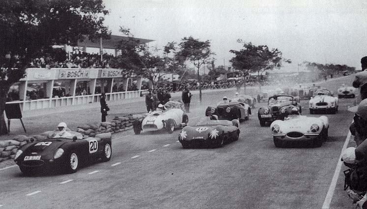 GP de 1959: Bill Wyllie (20) com o seu DKW 1000RS, 3º no grid, faz uma boa largada e pula na frente. Porém quem venceu a prova com 3h 52m 23.5s a uma média de 63.51 mph foi o pole-position Hadwick. O Wyllie ficou em segundo com 59 voltas, duas à frente do Chan Lye Choon (10) com Aston Martin DB3S, que terminou em terceiro com 57 voltas. Alinhava em 1º R Hardwick (7) com um Jaguar XKSS e em 2º Peter Heath (10), o inglês gigante com Lotus 11. A melhor volta foi de Hardwick com 3m 24.1s (recorde).