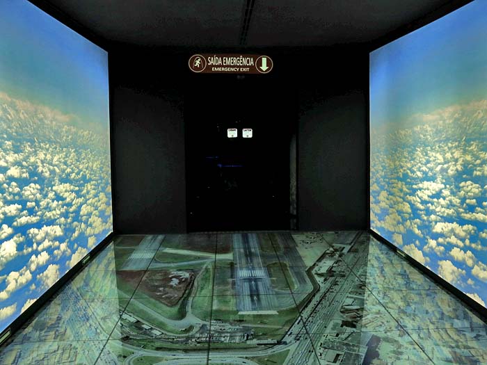 O primeiro acesso é por um corredor cultural, antes passando por um ambiente com nuvens dos dois lados e pisando sobre a fotografia do Aeroporto de Congonhas de São Paulo.