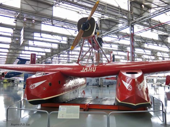 O Jahú, avião italiano Savoia-Marchetti SM-55. Fez a travessia do Oceano Atlântico em 12 horas a 190 km/h, partindo de Cabo Verde (ilha portuguesa) até Fernando Noronha/Brasil, um feito de brasileiros no ano 1927.