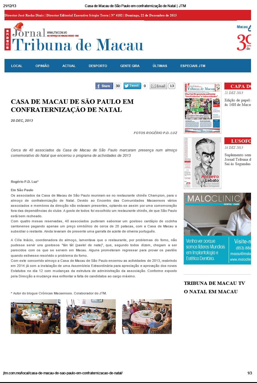O almoço de confraternização do Natal de 2013 promovido pela Casa de Macau de São Paulo foi noticia no Jornal Tribuna de Macau.
