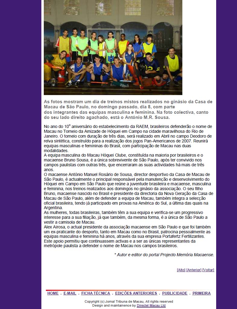 Em 15 de Março de 2009, portanto há cerca de 5 anos atrás, o Jornal Tribuna de Macau publicou meu artigo sobre a equipe (equipa) de hóquei que tinha (e tem ainda) o nome de Macau. Um grande trabalho resultante do esforço do macaense António (Toninho) Sousa, que hoje preside a agremiação esportiva (desportiva) com o nome de Macau e ainda disputa competições no Brasil com a camisa nas cores da sua terra natal.