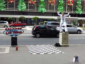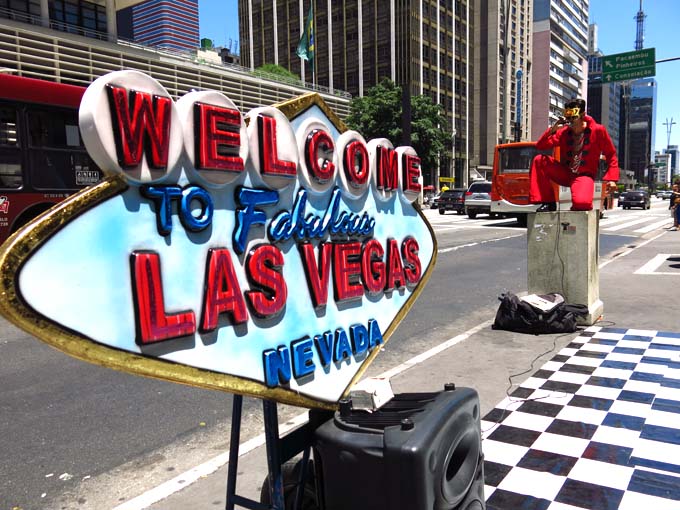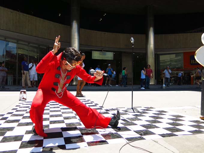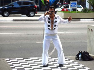 No último sábado, 1º de fevereiro de 2014, lá pelas 12:50 hrs num calor infernal de 35 graus de queimar os miolos lá estava ele fazendo sua atuação diante de um público que variava a toda hora. Com uma voz que quer lembrar Elvis Presley, cantava as canções mais conhecidas do seu ídolo, tendo ao lado seu cartaz de Las Vegas, um violão preto, microfone dos anos 40 e sob um piso xadrex. Uma caixa acústica amplificada alimentada por bateria fazia a sua voz soar pela avenida e pelos corredores do Shopping Center 3 avisando: “Elvis da Paulista is performing” (está em atuação).