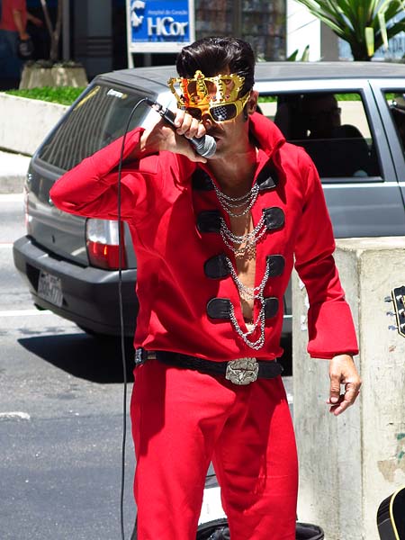 Versátil, da penúltima vez que o vi, também num sábado lá por volta das 13:30 horas, também sob um sol forte, cantava música brasileira pra variar. Mas, acredito que o seu forte e que o levou à fama é o repertório do Elvis, que é a referência dos seus trajes.