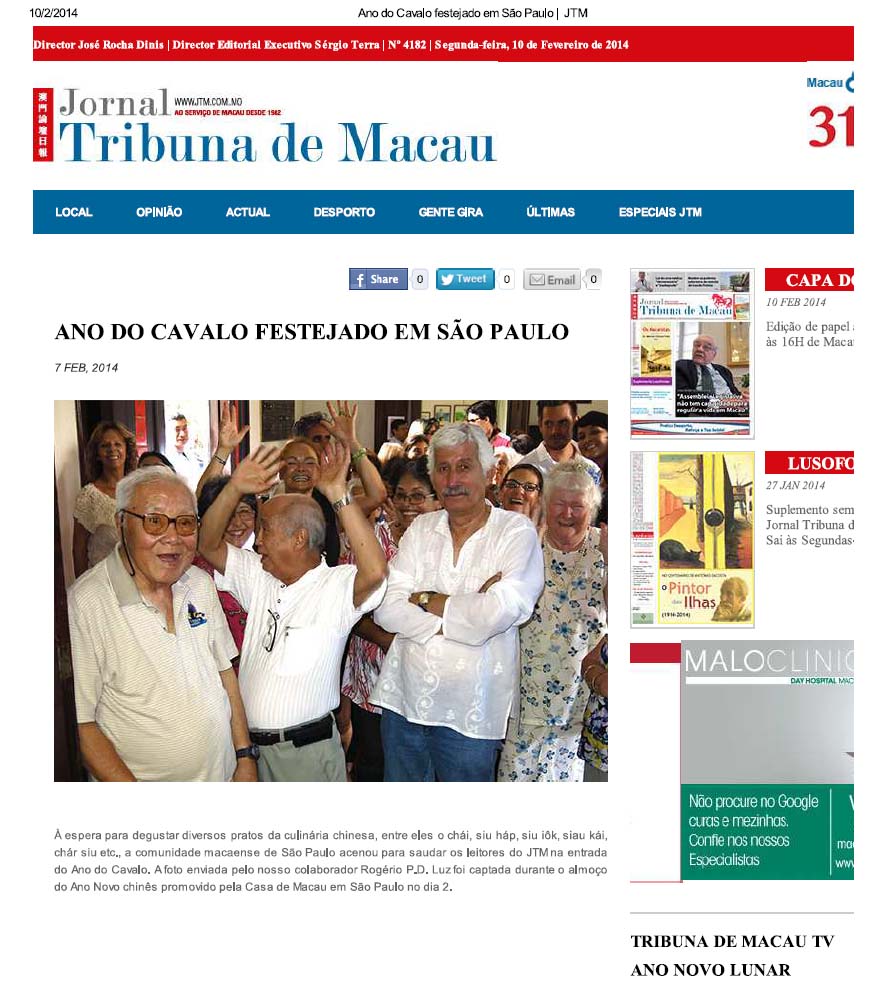 Na seção de Gente Gira do Jornal Tribuna de Macau, edição de 07/02/2014, publicada foto do pessoal da Casa de Macau de São Paulo saudando o Ano do Cavalo na festa do Ano Novo chinês.