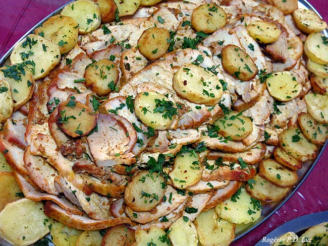 É uma adaptação da «paella» que aqui chegou de Valência, via América Latina ou via Filipinas. Consiste em arroz cozido num caldo de ossos de galinha e depois refogado em cebola, tomate e açafrão, à portuguesa. Em seguida, mistura-se com passas de uva, lâminas de amêndoa torrada, cubos de pão frito, rodelinhas fritas de chalota, azeitonas pretas e verdes. A iguaria é então disposta numa travessa às camadas, alternando com rodelas de chouriço, presunto e galinha ornamentada com ovos, pimentões e agrião. Há quem junte chispe, o que acho de mau gosto, pois faz perder o requinte do prato.