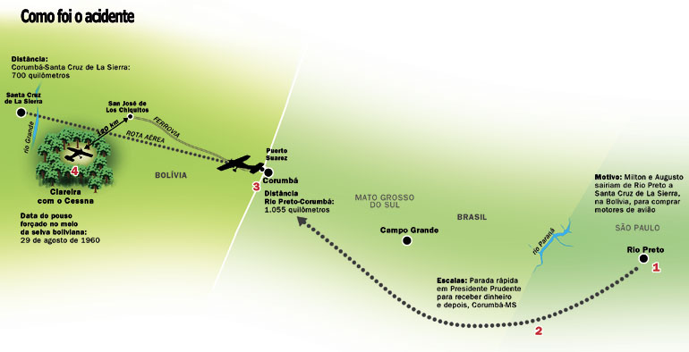 1960) e seu cunhado Antonio Augusto Gonçalves (? – 7 de setembro de 1960) fizeram um pouso forçado com um Cessna 140 numa clareira na selva boliviana,tentando concluir o trajeto entre Corumbá e Santa Cruz de La Sierra, a fim de comprar um motor de avião. Eles haviam saído da rota e fizeram a aterrissagem forçada na referida clareira devido à falta de combustível.