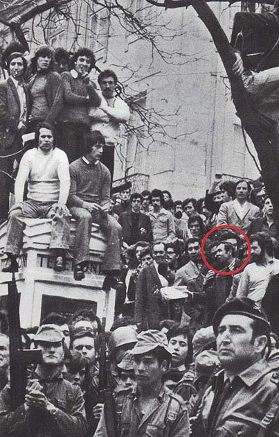 Largo do Carmo, 25 de Abril de 1974: Carlos Estorninho entre a multidão (no círculo vermelho). Imagem e texto da Revista Macau Abril de 1994