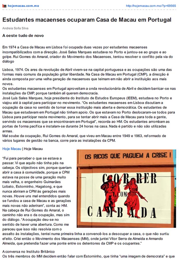 REPRODUÇÃO DO ARTIGO DE ANDREIA SOFIA SILVA DO JORNAL HOJE MACAU EDIÇÃO DE 25/04/2014