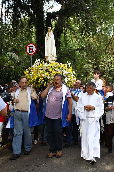 Acima, a imagem peregrina de Nossa Senhora de Fátima que veio de Portugal, e que é uma das cinco existentes, sendo cada uma destinada a cada continente. Após o dia 13, a imagem irá peregrinar por várias paróquias da cidade e por diversos municípios do Estado de São Paulo e do Paraná. Antes, já peregrinou por algumas localidades, inclusive pelo Palácio do Governo Estadual.