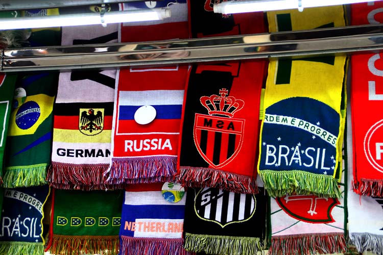 Estes cachecóis na semana passada estavam a R$ 25,00 e com a Copa em andamento já aumentaram para R$ 35,00. Após a Copa deve baixar de preço, aí dá para comprar para souvenir.