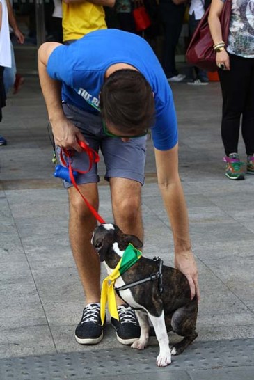 O cachorrinho foi passear de cachecol das cores do Brasil