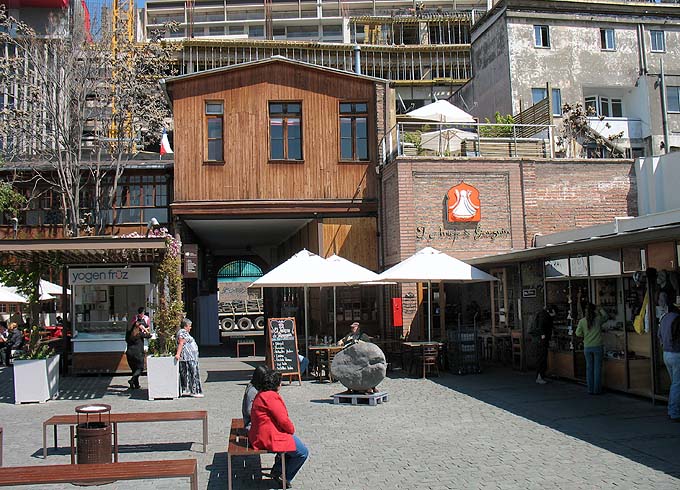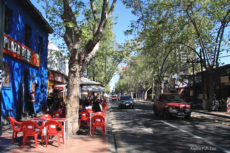 Até lembra um pouco El Caminito de Buenos Aires com suas casas coloridas e mesas postas nas calçadas, mas não fale isso para os chilenos, a rivalidade com os argentinos é grande, o que é inverso com os brasileiros que são bem recebidos. Na época da minha visita à capital do país, a maioria dos turistas eram brasileiros. Era moda viajar ao Chile, não tanto quanto agora, ao que me parece. Afinal, Chile é logo aí, não tão longe de avião e tem neve, até na primavera, época em que viajamos e lucramos com as visitas às estações de esqui, pois com o fim de temporada, estavam abertas para visitação geral a pé, inclusive pelas pistas. Valeu a pena pois ainda tinha bastante neve e não tão gelado assim.