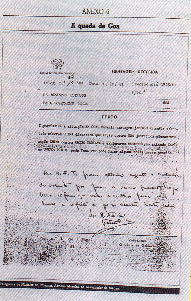 “É gravíssima a situação de Goa. Haveria vantagem jornais urgente sobretudo afectos China dissessem que acção contra Goa justifica plenamente acção China contra União Indiana e explorarem contradição atitude Governo União. MNE pede Vexa ver pode fazer alguma coisa nesse sentido“.