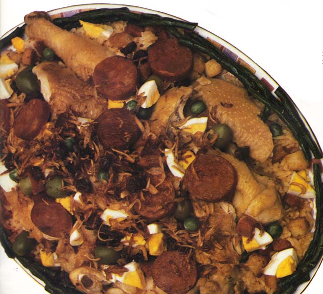 Dispor o arroz numa travessa e enfeitar com os pedaços de galinha e os restantes ingredientes, deixando para última camada o pão frito e a cebola-da-Índia, para não amolecerem.