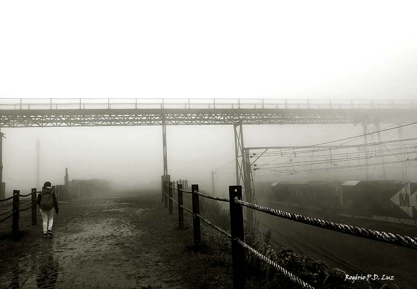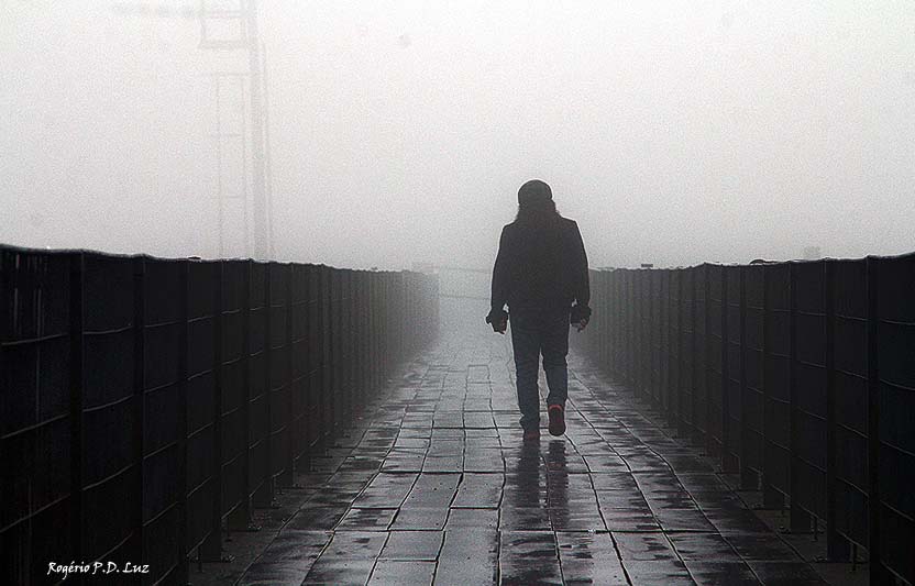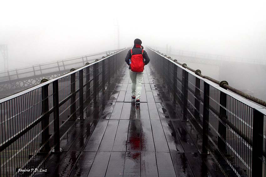 A travessia da ponte metálica que liga a parte alta e a baixa, em dias de nevoeiro é andar para o nada