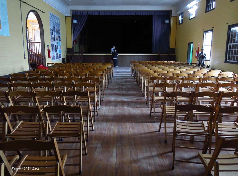 O prédio em madeira, coberto por telhas francesas, possui um hall de entrada que distribui os acessos. O salão se transformava em quadra de futebol. Por cima do palco, apreciam-se as urdiduras do teto para a sustentação de cenários dos espetáculos que ali ocorriam.
