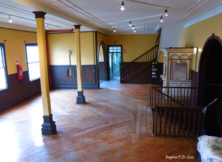 A boca de cena possuía adaptação para descida de tela que projetava filmes de cinema. Na parede oposta, existem os visores da sala de projeção, onde se pode ver os dois projetores originais fixados ao chão. Nas laterais, existem dois camarotes que foram utilizados pelo alto escalão da São Paulo Railway e placas metálicas com os nomes dos frequentadores.