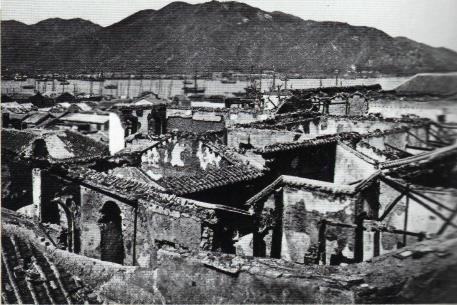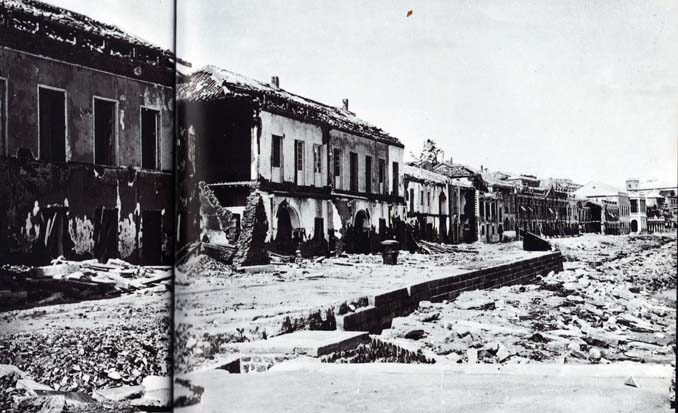 Igreja de Santo António, parcialmente consumida por um incêndio. Nesta foto, vê-se ainda o edifício que havia no local onde hoje é a entrada para o Jardim Camões