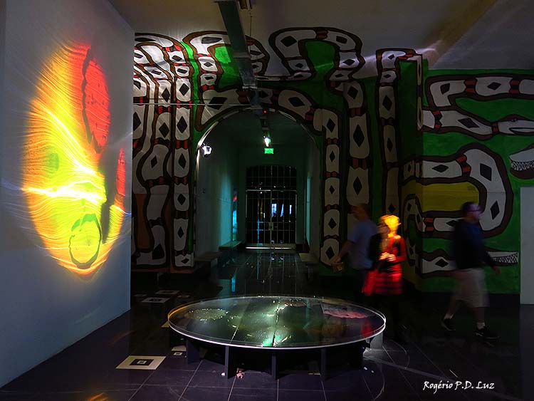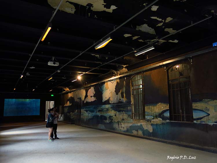 Acima – foto da esquerda: “A escadaria central, onde está um busto do Conde Matarazzo, é um dos pontos mais fotografados do velho hospital. E o óleo negro que cobre o chão ao redor da escada é obra de Per Barclay, que ressalta ainda mais a bela estrutura arquitetônica. O artista trabalha com noções de dentro e fora, espaços confinados e abafados. O óleo cria um espelho que reflete a escada inalcansável pelo visitante, criando um jogo ilusório de sobe e desce, céu e inferno. Per Barclay é norueguês mas começou sua carreira na Itália, onde estudou em Florença, Roma e Bolonha. Ele usa diversas mídias em abordagens bastante conceituais para ressaltar o espaço (texto da página de Feito por Brasileiros no Facebook)”.