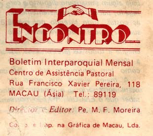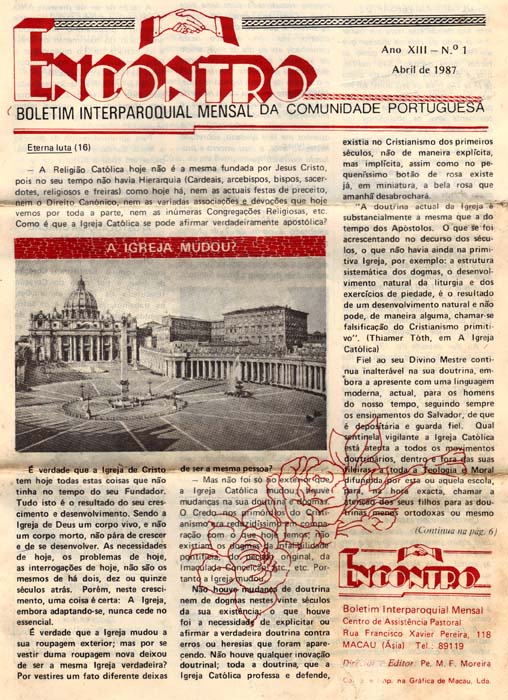 ENCONTRO, que nasceu em 1959 na paróquia de S. Lourenço para os paroquianos da mesma freguesia, em 1974 passou a ser a voz de todas as paróquias de Macau, perfazendo este ano 13 anos de vida como Boletim Interparoquial Mensal da Comunidade Portuguesa.