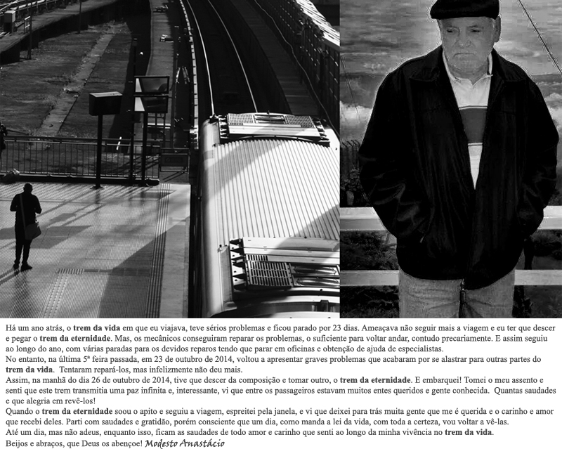 Até um dia, mas não adeus, enquanto isso, ficam as saudades de todo amor e carinho que senti ao longo da minha vivência no trem da vida. Beijos e abraços, que Deus os abençoe! Modesto Anastácio”