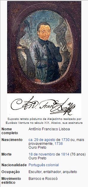 Aleijadinho (1738-1814) nasceu em Vila Rica, hoje Ouro Preto, Minas Gerais, em 1738, segundo a maioria dos biógrafos. Filho do português Manuel Francisco Lisboa, mestre de carpintaria, que chegou a Minas Gerais em 1723, e de sua escrava Isabel. Estudou as primeira letras, latim e música, com os padres de Vila Rica. Teve como mestre nas artes, os portugueses João Gomes Batista e Francisco Xavier de Brito. Aprendeu a esculpir e entalhar ainda criança, observando o trabalho de seu pai que esculpiu em madeira uma grande variedade de imagens religiosas, e de seu tio Antônio Francisco Pombal, importante entalhador de Vila Rica.