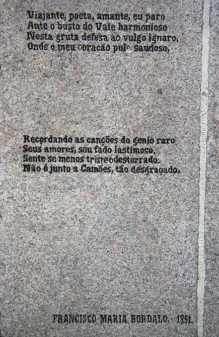 «Gruta de Camões — o busto do poeta, escultura de M. M. Bordalo Pinheiro, mandado erigir em 1866 pelo benemérito comendador Lourenço Pereira Marques».