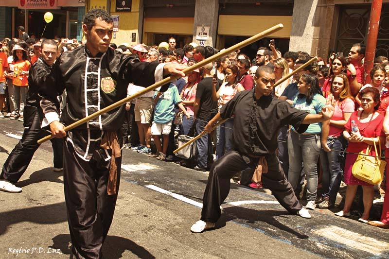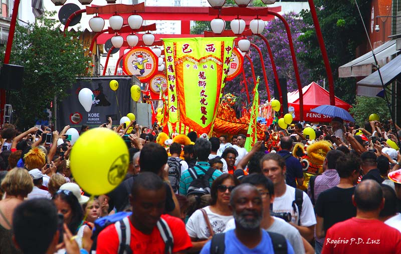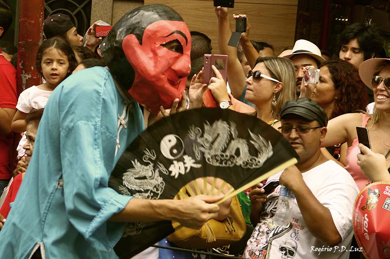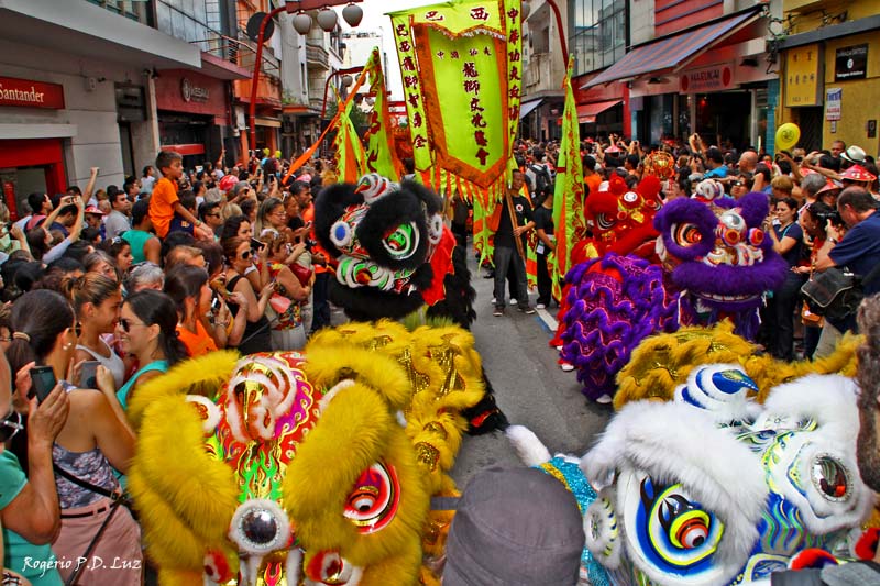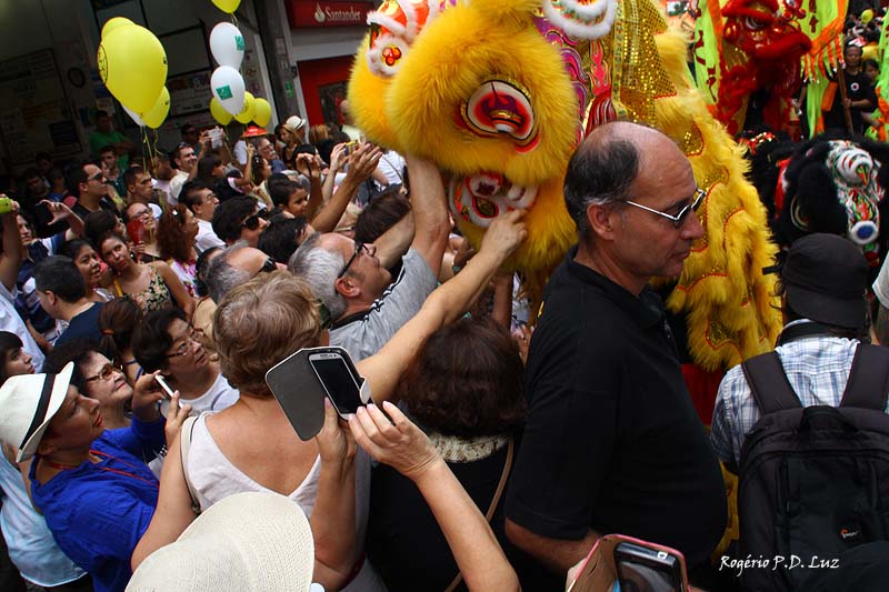 Estive no sábado, dia 21, na Liberdade, para assistir o tradicional desfile de inauguração dos festejos com a dança do leão e do dragão. Bastante divulgado pela rádio e tv, até pela senhora Rede Globo, a região estava entupida de gente, até se percebe o público a crescer a cada ano. Quase todo mundo fotografava ou filmava com seus celulares. Muita gente, agora mais conhecedor da superstição e costumes chineses, procurava tocar os leões “para dar sorte” no novo ano do calendário chinês.