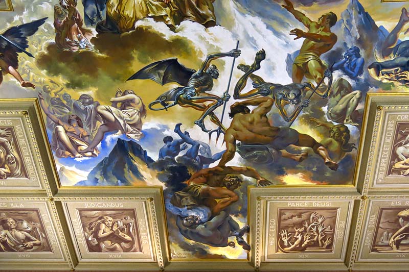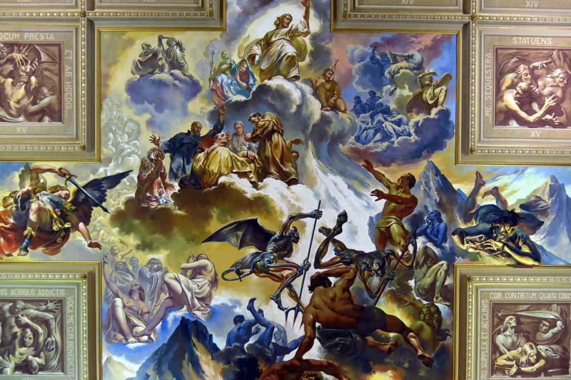 (Wikipédia) Os murais também cobrem todo o teto da igreja, ilustrando a Criação do Cosmo, a Criação da Mulher, a Expulsão do Paraíso e o Juízo Final, rodeados de uma série de caixotões com imagens inspiradas no hino Dies irae